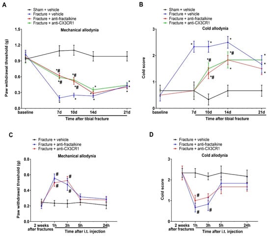 Pharmacological inhibition of fractalkine/CX3CR1 protects against fracture-associated chronic allodynia. (A,B) The anti-fractalkine and anti-CX3CR1 were intrathecally applied (20 μg) on days 3, 4, 5, and 6 after the fracture surgeries. The mechanical allodynia and cold allodynia were measured. (C,D) Post-treatment with anti-fractalkine and anti-CX3CR1 (20 μg) via the intrathecal route two weeks following the orthopedic surgeries considerably ameliorated the existing mechanical and cold allodynia. All behavioral results are shown as means ± SEM (n = 6) and analyzed by a two-way ANOVA with Bonferroni post hoc comparisons. * p < 0.05 vs. group sham + vehicle; # p < 0.05 vs. group fracture + vehicle.