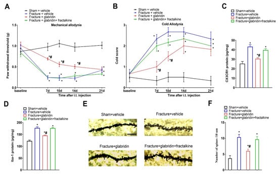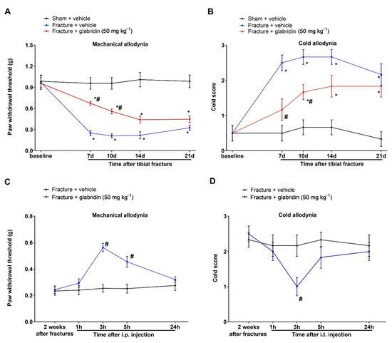 Intraperitoneal injections of glabridin reduce the generation and maintenance of chronic allodynia elicited by the tibial fractures. (A,B) Glabridin was intraperitoneally injected (50 mg kg−1) on days 3, 4, 5, and 6 following the fracture surgeries. The mechanical and cold pro-nociceptive phenotypes were measured. (C,D) The intraperitoneal application of glabridin (50 mg kg−1) two weeks following the fractures considerably ameliorated the existing mechanical and cold allodynia. All behavioral results are shown as means ± SEM (n = 6) and analyzed by a two-way ANOVA with Bonferroni post hoc comparisons. * p < 0.05 vs. group sham + vehicle; # p < 0.05 vs. group fracture + vehicle.