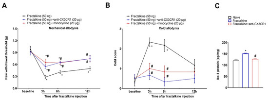 Acute nociceptive phenotypes are initiated by exogenous fractalkine and ameliorated by co-applications of minocycline. The microglial inhibitor minocycline (i.t.; 20 μg) and anti-CX3CR1 (i.t.; 20 μg) were given one hour prior to the delivery of the recombinant fractalkine (i.t.; 50 ng). (A,B) The exogenous fractalkine-evoked acute nociceptive phenotypes were ameliorated following the pre-applications of minocycline and anti-CX3CR1, respectively. All behavioral results are shown as means ± SEM (n = 6) and analyzed by a two-way ANOVA with Bonferroni post hoc comparisons. * p < 0.05 vs. baseline; # p < 0.05 vs. group recombinant fractalkine (50 ng). The biochemical experiments were performed 3 hours following the fractalkine injections. (C) The ELISA experiments showed that anti-CX3CR1 decreased the overexpression of the Iba-1 proteins in the dorsal horn following the exogenous fractalkine injections. All biochemical results are expressed as means ± SEM (n = 5) and analyzed by a one-way ANOVA with Bonferroni post hoc comparisons. * p < 0.05 vs. naïve; # p < 0.05 vs. group recombinant fractalkine.