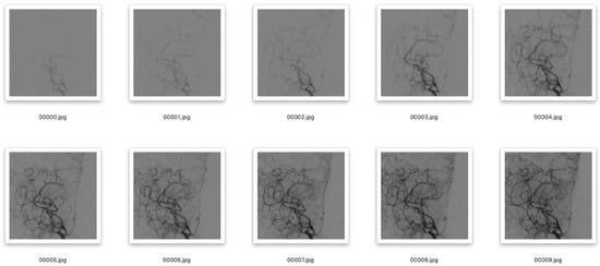 The cause of moyamoya disease (MMD), a relatively unusual cerebrovascular disease, is unknown. It is known as MMD because it is characterized by stenosis or occlusion in the terminal part of the internal carotid arteries (ICA), the beginning part of the middle cerebral artery (MCA) and the anterior cerebral artery (ACA), which results in the presence of small vessels that resemble smoke in the brain []. MMD is quite damaging, with a high mortality rate and disability rate. The clinical symptoms of MMD include ischemic and hemorrhagic strokes. MMD brought on by a hemorrhagic stroke will seriously damage the cranial nervous system, which is a significant factor in patients’ poor prognosis and eventual death [,,]. Once a cerebrovascular accident occurs, it will cause permanent damage to the body, and may even cause the patient to die []. Magnetic Resonance Angiography (MRA), Computed Tomography Angiography (CTA), and Digital Subtraction Angiography (DSA) are the three most commonly utilized diagnostic methods for MMD. The gold standard for the diagnosis of MMD in clinical practice is DSA [], and the diagnosis is based on pathological alterations in the cerebral vasculature that occur in MMD []. To create a continuous subtraction image sequence with a high temporal resolution and a high dynamic resolution, DSA equipment can continually take a few to dozens of images per second.