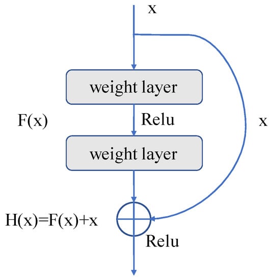 The identity map (arc part in Figure 3) and residual map (straight line part in Figure 3) are connected to the output by jump connections in each residual unit, as shown in Figure 3. This operation can produce the final output from the input data x and the output data F(x) obtained through the weight layer, that is, H(x) = F(x) + x. The residual mapping path passes through the weight layers, increasing the depth of the network and enhancing its functionality. It is customary to raise the network’s layer count in order to improve the network’s accuracy and feature extraction capabilities. The network will approach saturation once the number of layers reaches a certain level, and network degradation will become a problem. Due to the identity mapping that is applied to the residual unit, the ultimate result can still be H(x) = x, even if F(x) is 0. Without identity mapping, the network loses its capacity for forward propagation and back propagation, and the parameter update of weight layers becomes stalled, making it impossible for the network to learn new features. Additionally, leveraging jump connections to incorporate the input data into the output data can significantly increase the integrity of information, ease the burden of training the network, and lower computational costs.