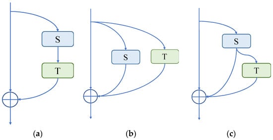 As can be seen in Figure 4, three P3D residual modules, named P3D-A, P3D-B, and P3D-C, were designed. Among them, P3D-A connects spatial convolution S and temporal convolution T in series, ensuring the depth of the network under the same receptive field conditions, and improving the performance of the network to a certain extent. P3D-B uses a parallel structure to facilitate the distributed computing of features. P3D-C integrates series and parallel operations into a module, effectively fusing and supplementing feature information, so as to enrich it.