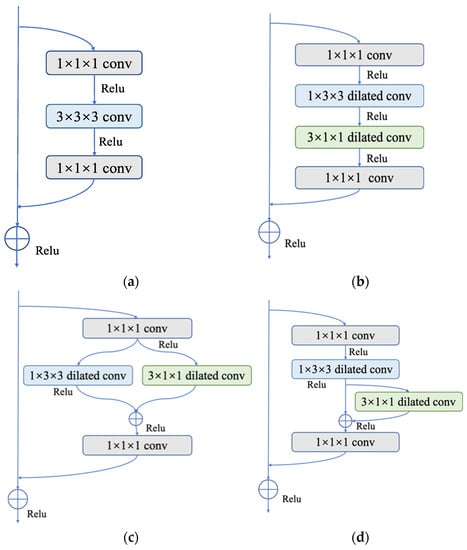 One can change the dimensions of the feature map and decrease the difficulty of the calculation by adding a 1 × 1 convolution layer before and after the 3 × 3 convolution layer to create a bottleneck structure in ResNet. As shown in Figure 5, three bottleneck structures in P3D module are available when we extend the operation from a 2D CNN to a 3D CNN.