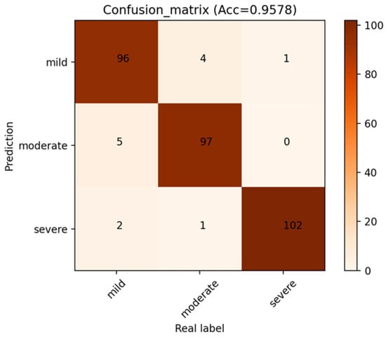 The confusion matrix of the model is displayed in Figure 6 in order to examine the effectiveness of the methodology suggested in this paper. Each column’s sum indicates the actual number of samples in this category, whereas each row’s sum represents the number of samples predicted to be this category. It can be observed that the outcome of MMD staging includes the number of accurate classifications and the number predicted to be other categories. The numbers of accurately identified MMD stages are represented by the number on the diagonal path with a deep color. Because of the more pronounced characteristics of severe MMD, in which it is clear that the number of moyamoya-like vessels is greatly decreased, the number of accurately recognized severe MMD samples is the highest. The numbers of correctly classified moderate MMD cases and mild MMD cases are lower than those of severe MMD cases, primarily because mild MMD and moderate MMD may have some similar feature points, making it simple for the model to be interfered with.
