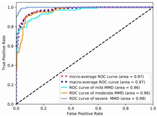 The precision, recall, specificity, F1 score, and AUC of mild, moderate, and severe MMD are all shown in Table 1, in that order. The table shows that this model achieves the maximum precision of 0.971 for severe MMD, and the AUC is 0.99, demonstrating the superior performance of P3D ResNet in the detection of severe MMD. Meanwhile, the precisions for mild and moderate MMD are, respectively, 0.95 and 0.951, and are lower than that for severe MMD. Due to the possibility of misinterpretation between the features of mild MMD and moderate MMD, ROC curves for various MMD stages are displayed in Figure 7. It is clear that the model has the best classification performance for severe MMD because the AUC of the condition is closest to 1. Both mild and moderate MMD have an AUC of 0.96. When calculating the micro-average ROC curve, each component of the label indicator matrix is treated as a label. The macro-average ROC curve is derived from the unweighted mean of each label, and the AUC reaches 0.97, indicating that the model has excellent overall classification performance.