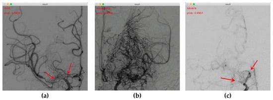 Our findings indicate that P3D ResNet is capable of accurately identifying the MMD stages. The staging results for mild, moderate, and severe cases are shown in Figure 8a–c, respectively. The probabilities are 0.9835, 0.9869, and 0.9901, respectively. In Figure 8a, it can be seen that the ICA and ACA are narrowed at the red arrow, and an abnormal vascular network begins to appear at the skull base, which is defined as mild MMD in this study. In Figure 8b, we can clearly observe that a large number of abnormal vascular networks have formed, which is defined as moderate MMD in this study. Figure 8c shows that the ICAs, ACAs, and a large number of abnormal vascular networks have disappeared, which is defined as severe MMD in this study. It is evident that the model has a positive impact on classifying the MMD stages. This demonstrates the viability and efficacy of the approach in the actual clinical staging of MMD.