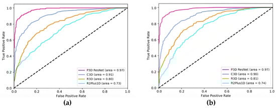 The micro-average ROC curve and macro-average ROC curve for each model are displayed in Figure 9a,b, respectively. The AUC of P3D ResNet with pretraining is higher than that of C3D with pretraining, and that of R3D and R2Plus1D without pretraining in both the macro-average and micro-average ROC curves, as can be seen in Figure 8. This demonstrates the effectiveness of the classification effect of P3D ResNet.