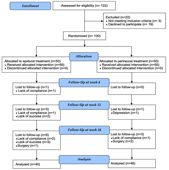 The study is limited by the absence of planned sample size calculation for confirmatory hypothesis testing, resulting in an exploratory approach. The study is monocentric, meaning that the findings may not be generalizable to other settings or populations. There is a lack of a comparator drug (placebo or corticosteroid), which limits our ability to compare the effectiveness of ACS treatment to other modalities directly. Subjective questionnaires were used to analyze outcomes, which may be subject to bias or variability in interpretation. A limited follow-up was performed, which may have affected our ability to capture long-term outcomes and potential adverse effects. The dropout rate was 10 out of 50 patients (20%) in the epidural group and 4 out of 50 patients (8%) in the perineural group. However, in the epidural group, 9 out of the 10 patients dropped out of the study due to lack of compliance or lack of success, and only 1 patient dropped out due to a valid reason—surgery. In the perineural group, only one patient dropped out due to lack of compliance, while the other three had valid reasons such as surgery or depression. If noncompliant or failed patients were defined as nonresponders in the response analysis, the results of the study would even more clearly favor the perineural group.