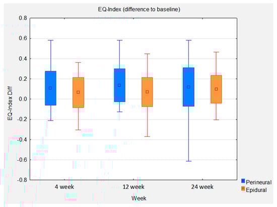 Box whisker plots of EQ-Index difference to baseline between groups at control time points.