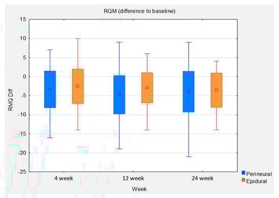 Statistical analysis of the RMQ between baseline and 24 weeks shows a mean improvement of 3.55 in the epidural group. This gives an effect size of 0.79 (p < 0.0001). The mean improvement in the perineural group is higher at 3.94. However, the effect size is lower at 0.74 (p < 0.0001) due to the higher standard deviation in this group. The between-group comparison shows a slight mean difference of 0.38 in favor of the perineural group. The between-group effect size is 0.08. The statistically significant noninferiority of the perineural group compared with the epidural group at weeks 4 and 12 could not be reproduced at week 24 (Figure 6).