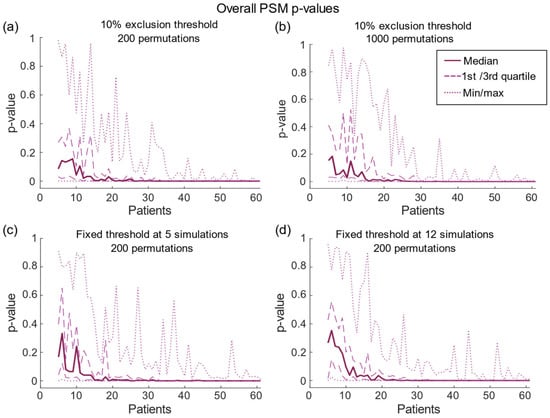 The result for the overall p-values can be seen in Figure 1. With 200 permutations, the variation in overall p-value was higher for small sample sizes (max IQR = 0.333, n = 8) but reached low p-values around 20–30 patients, i.e., 80 to 120 simulations, with only a few outliers (IQR = 0, n > 35). A similar result was seen with 1000 permutations (Figure 1b) (max IQR = 0.495, n = 11; IQR = 0, n > 35) and for the fixed exclusion thresholds (Figure 1c,d) (max IQR = 0.530/0.413, n = 6/5; IQR = 0, n > 35/35 for threshold of 5 and 12, respectively) but with slightly larger variation for low sample sizes.