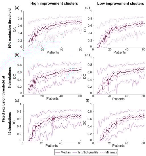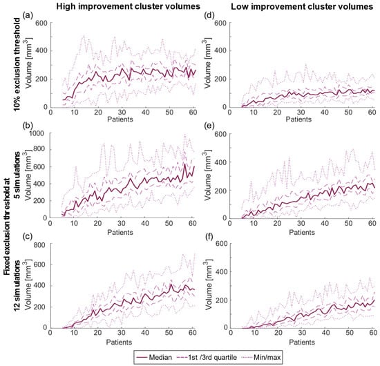 Computed cluster volumes for (a–c) high improvement and (d–f) low improvement for the 10% exclusion threshold (top row), and fixed threshold at 5 simulations (second row) and 12 simulations (bottom row).