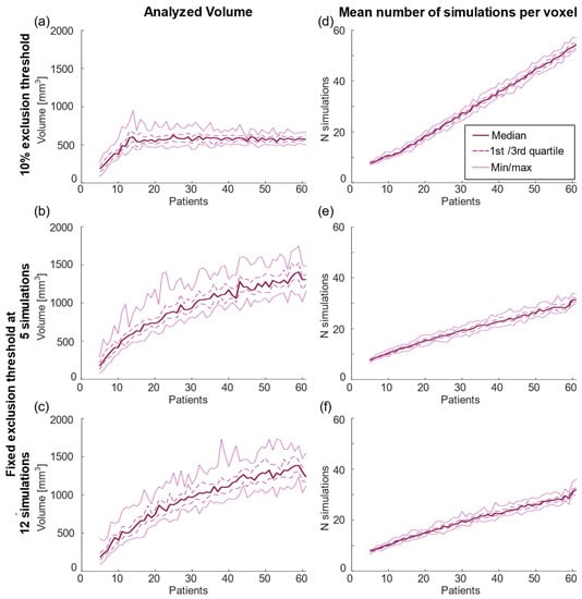 The total volume included in the statistical analysis (a–c), and the mean number of simulations in the analyzed voxels (Ni) (d–f) for the 10% exclusion threshold (top row), and fixed threshold at 5 simulations (second row) and 12 simulations (bottom row).