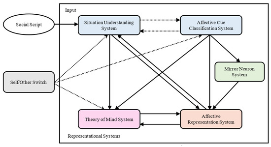 According to the self-to-other model of empathy (SOME) [13], the process of empathy includes five representation systems, namely situational understanding, affective cue classification, theory of mind, affective representation, and mirror neurons; furthermore, they are affected by the self–other switch (see Figure 1). One key reason for the empathic deficiency in autistic individuals is the imbalance of the self–other switch. For ordinary people, the default state of the self–other switch is “self”, and when activated, it transforms from “self” to “others”. It is difficult for autistic individuals to activate this system, leading them to focus too much on themselves and their interests and ignore the emotions and feelings of others. Even when they notice others, it is difficult for them to recognize the difference between themselves and others and revert from “others” back to “self”; therefore, they are sometimes overly affected by the other person’s state and show excessive emotional reactions [14,15]. Structured laboratory studies often give specific tasks so that autistic individuals can be instructed to activate the self–other switch. When their empathic representation systems are relatively intact, they can show a good level of empathy. However, in daily life, complex information and lack of clear instructions affect the function of the self–others switch, leading to a deficiency in empathy in autistic individuals. The SOME can explain the autistic individuals’ empathy characteristics and the differences between laboratory research results and clinical practice; however, it needs to be verified through empirical intervention studies [16].