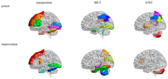 Pearson correlation was performed for the transposition, IRI-T, and ATEC pretests in the experimental group. There was no significant correlation among them (ps > 0.05), indicating no multicollinearity. The lie pretest was positively related to the PT pretest, r = 0.51, p < 0.05, indicating that the transposition ability and IRI-T ability had a correlation but more differences, and they could not be added up. Therefore, it was necessary to separately examine the relevant brain areas of the transposition, IRI-T, and ATEC pretests and their improvements.
