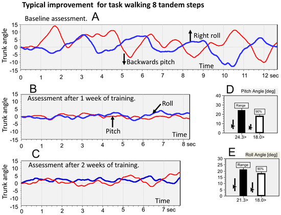 Example of the reduction in pitch and roll lower-trunk sway amplitudes for tandem gait trials of a dizziness only (DO) patient, compared to baseline (upper traces, (A)). Traces recorded after 1 week of training with vibro-tactile feedback (VTfb) of lower-trunk pitch and roll sway angles are shown in (B) (middle traces), and after 2 weeks of training in (C) (lower traces). Note how most improvement (reduction in amplitude) in trunk sway occurs during the first week of training as shown in (B) compared to the sway after 2 weeks of training shown in (C). The inserts (D,E) compare the peak-to-peak (Range) and 90% values for the data shown in (A) with normal reference values of controls. The vertical bars next to the columns in (D,E) mark the 90% range of controls, and the triangles on the vertical bars mark the median values of controls. The values for the data of (A) are listed below the columns in (D,E). The range and 90% values are 24.3 and 18.0 in (D), and 21.3 and 18.0 in (E). VTfb thresholds computed from the baseline assessment (A) were ±7.2 deg (18.0 × 0.4) for pitch and roll. After 1 week of training, these thresholds were reduced to ±1.4 deg for pitch and ±1.8 for roll.
