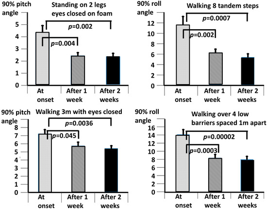 The differences seen in Table 2 translated into significant changes with VTfb training across the combined QBD and DO populations. In Figure 2, in addition to the task of walking tandem steps, the population values for three other tasks included in the BCI measure are also shown. For each task in Figure 2, the trunk sway amplitudes at 2 weeks were significantly less than the onset measures (p ≤ 0.004). In contrast, the significance for each task between the onset and 1-week values was always less (p ≤ 0.045). Furthermore, there was no difference between the 1 and 2-week values (p, 2-sided, ≥0.05).