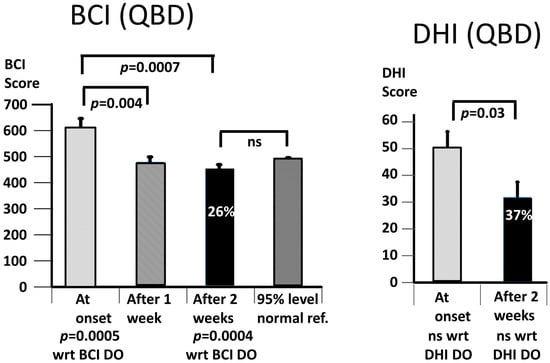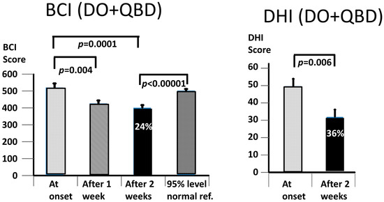 As expected, the BCI scores at the onset were greater for the QBD group (p = 0.0005) than for the DO group (Figure 5). Likewise, the BCI score at 2 weeks (p = 0.0004) was also greater—see Figure 5. Interestingly, the DHI scores were not different between the two groups, neither at onset nor after 2 weeks of training—see Figure 4 and Figure 5. Furthermore, the percentage changes in the DHI values were very similar (35 and 37% for the DO and QBD groups, respectively). The change was, however, only significant for the QBD group. Furthermore, the change in the mean DHI scores (19) for the QBD group was very similar to the minimum clinically important difference (18) for those with vestibular deficits [34]. In contrast, the 21% change in the BCI value for the DO group between the onset and 2 weeks was highly significant (p = 0.00013), as was the larger 26% change for the QBD group (p = 0.0007). As the onset BCI values for the DO subjects were always lower than the 95% value of the age-matched healthy controls by group entry definition, it was not surprising that the BCI value at 2 weeks was statistically less than the average 95% normal control reference value (p < 0.00001). For the QBD group, there was no statistical difference between the 2-week value and the average 95% normal reference value.