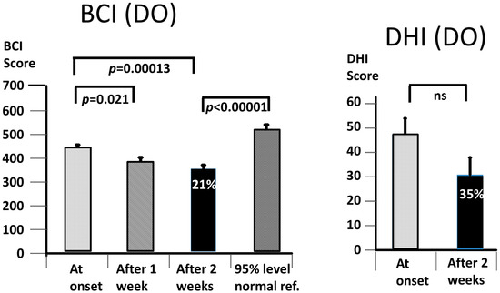 Improvement of Balance Control Index (BCI) values and Dizziness Handicap Inventory (DHI) scores for DO subject data only. The layout of the figure is identical to that of Figure 3. ns, stands for not significant.