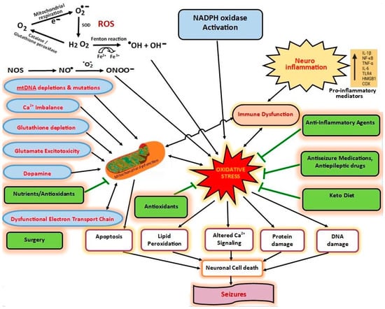 Epileptic seizures induce oxidative stress, which can cause further neuronal damage and lead to the development of subsequent seizures in a chain reaction [75]. Acute seizures result in excess ROS formation through increased mitochondrial dysfunction and increased NOX activity [76,77,78]. Additionally, glutamate receptor activation and excitotoxicity, which are two mechanisms of brain injury in epilepsy, contribute to oxidative stress [79]. The persistent neuronal firing that accompanies epilepsy can lead to the formation of free radicals, which can leak from the electron transport chain and react with oxygen to cause oxidative stress [43]. Consistent with this, persistent epileptic seizures have been found to result in nucleic acid, lipid, and protein oxidation, leading to cellular damage [70].