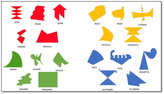 - Presentation of stimuli in a fixed, predetermined order: The order of presentation was selected according to the difficulty and complexity of the neologisms and their respective figures. First the red group was presented, which mainly consisted of disyllabic and—only occasionally—trisyllabic words with the same initial letter (“soro”, “polve”, “scepa”, “venopa”, “vocalla”), then the yellow group (“neole”, “braze”, “curango”, “celtollo”, “chefrotta”) with two disyllabic and three trisyllabic words, then the blue group (“nace”, “fogu”, “bigliotta”, “giuttagra”, “tillobore”) with words of different length (two to four syllables). Finally, the green group was presented (“ganno”, “guonta”, “micacia”, “afelente”, “panilanto”): it was the most complex group, as it included two words with four syllables. During the presentation, an attempt was made to memorize the characteristics of the individual figures without asking to recall the corresponding neologism. For example, the “soro” figure was shown and the individual was invited to pay attention to the different triangles that formed this figure.