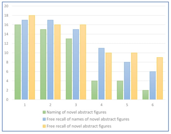 - “Novel words to novel abstract figures (abstract distractors)” matching test: the individual is presented with 20 sheets. Each sheet contains 5 of the abstract learned figures arranged vertically; the figures are presented in random order but each stimulus appears the same number of times as all the others. One of the 5 figures represents the target and the others are distractors. The examiner reads out the novel word and asks the individual to indicate the corresponding figure. The maximum score is 20.