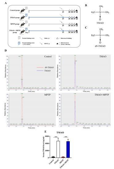 TMAO significantly increased the serum TMAO levels in the mice: (A) schematic diagram of the animal experiment; (B) chemical formula for TMAO; (C) chemical formula for d9-TMAO; (D) representative ion chromatograms for LC–MS detection; and (E) serum TMAO concentration. n = 5/group. *** p < 0.001.