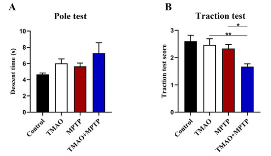 TMAO partially exacerbated motor dysfunction in the PD mice: (A) the descent time of mice in the pole test; and (B) scores of mice in the traction test. n = 5/group. * p < 0.05; ** p < 0.01.