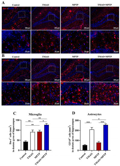 The effect of TMAO on hippocampal neuroinflammation has been reported. Herein, in order to explore the effect of TMAO on the hippocampus of the PD mice, Iba-1+ and GFAP+ glia cells in the hippocampal DG region were detected by IF. As shown in Figure 5, the activated microglia and astrocytes in the hippocampal DG in the MPTP and TMAO + MPTP groups were increased to varying degrees compared with the control and TMAO groups. Specifically, compared with the control group, TMAO significantly induced the activation of astrocytes in hippocampal DG (Figure 5B,D). More importantly, compared with the MPTP group, the microglia and astrocytes in the DG hippocampus were more significantly activated in the TMAO + MPTP group (Figure 5A–D). These results further support TMAO inducing glia-mediated hippocampal neuroinflammation.
