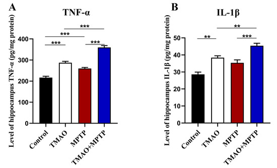We further evaluated the effect of TMAO on hippocampal neuroinflammation in the PD mice by detecting the levels of proinflammatory cytokines (TNF-α and IL-1β) by using ELISA. The results show that, compared with the control group, the hippocampal proinflammatory cytokines were significantly increased in the MPTP group, which is consistent with previous reports [20]. More importantly, the level of proinflammatory cytokines in the hippocampus of the mice in the TMAO + MPTP group was significantly higher than that in the MPTP group (Figure 6A,B). A similar result was observed in the TMAO group, with a significant increase in hippocampal proinflammatory cytokines in the TMAO group compared with the control group. These results suggest that the TMAO treatment induced neuroinflammation in the hippocampus of the TMAO-treated mice, and this proinflammatory effect was more severe and obvious in the TMAO + MPTP group mice, as manifested by higher levels of proinflammatory cytokines than in the MPTP group.