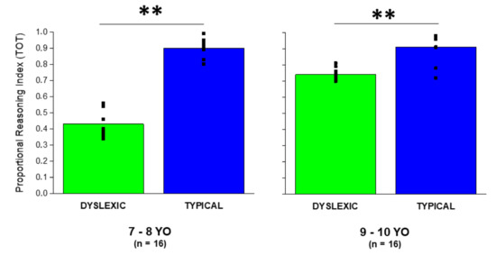 Comparison between typical and dyslexic children. Total index score is calculated as the average of correct responses across all trials (n = 64). The graphs clearly show that in both age ranges (7—8 and 9—10 years old), typical children outperformed dyslexic children when requested to provide judgments about proportionality. ** means p < 0.01.