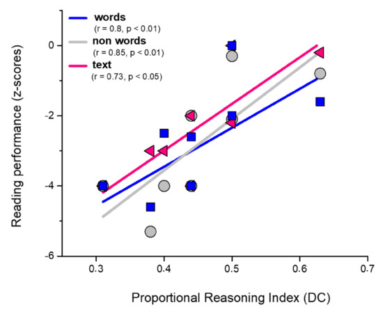 Correlation between reading and proportional reasoning abilities in dyslexic children. Correlation analysis indicates that a significant correlation exists between reading word (r = 0.8, p < 0.01), non-word (r = 0.85, p < 0.01), text (r = 0.73, p < 0.05) and proportional reasoning performance.