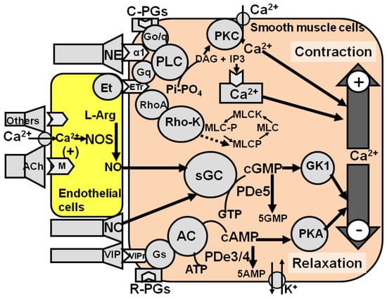 Briefly, under normal conditions, cavernous smooth muscles are contracted (e.g., the penis is flaccid). The main stimulatory control is mediated by noradrenaline, which acts on Go/q protein α1 receptors located in cavernous smooth muscle cells coupled to phospholipase C, which produces inositol triphosphate and diacylglycerol from phosphatidyl-inositol. Inositol triphosphate in turn releases Ca2+ ions from intracellular stores, while diacylglycerol activates protein kinase C (PKC) leading to an increase in intracellular free Ca2+ ions, causing contraction. Contributions to keep cavernous smooth muscles contracted are also provided by peptides (i.e., endothelins) and by contracting prostaglandins, which act with mechanisms similar to that of noradrenaline, and by the RhoA-Rho kinase system, which, when activated, keeps the myosin light chain phosphorylated by inhibiting myosin light chain phosphatase, thus facilitating the interaction between myosin and actin (see [8]). Relaxation of cavernous smooth muscles takes place when sexual stimuli activate the inhibitory tone mediated by acetylcholine and by NO to overcome contraction, leading to penile erection. Acetylcholine acts on muscarinic receptors located in endothelial cells, whose stimulation lead to increase the concentration of intracellular free Ca2+ ions. This in turn activates NO synthase, to produce NO. Endothelium-derived NO diffuses to smooth muscle cells and, together with NO released from nerve endings, activates soluble guanylate cyclase (GC). Soluble GC increases cGMP that acts on protein kinase GK1, causing a decrease in intracellular Ca2+ ions and inducing relaxation. cGMP action is terminated by PDe5. Cavernous smooth muscles also contain Gs-coupled protein receptors for endogenous peptides (i.e., vasoactive intestinal peptide, calcitonin gene-related peptide) and relaxing prostaglandins coupled to adenylate cyclase (AC). The activation of these receptors increases the concentration of cyclic adenosine monophosphate (cAMP), which acts on protein kinase A, decreases intracellular free Ca2+ ions and facilitates relaxation. cAMP action is terminated by PDe3/4 (Figure 2). Alterations of these local mechanisms at various levels (from the synthesis and release of neurotransmitters, peptides, autacoids and others to their interaction with specific receptors, enzymes and subsequent transduction mechanisms activated by second messengers cGMP and cAMP, Ca2+ ions and others) may be targeted to cause relaxation of cavernous smooth muscles and facilitation of penile erection (see [2,4,5,6,8,11,12]) (Figure 2).