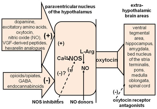 At variance from the local level, much less is known of the pharmacological targets suitable for the therapy of ED at the central level. This in spite of the fact that drugs that act as neurotransmitter agonists and/or antagonists and a few neuropeptides induce penile erection when given systemically and/or into specific brain areas [6,13,14,15,16,17,20,21,22,23,25,26,27,28,29,30]. Although preclinical studies revealed many likely molecular targets for ED treatment, it is unfeasible to treat ED by injecting drugs directly into brain nuclei controlling penile erection in order to obtain a selective pro-erectile effect. Thus, the only way of treating ED with centrally acting drugs is to use systemic drugs that act in these brain areas, particularly those from which neural pathways conveying sexual stimuli from the brain to the genital apparatus originate. One of these is oxytocinergic, originating in the PVN, which projects to extra-hypothalamic brain areas and to the spinal cord, and facilitates erection when activated [6,15,20,21,22,23,27,28,29,30] (Figure 3).