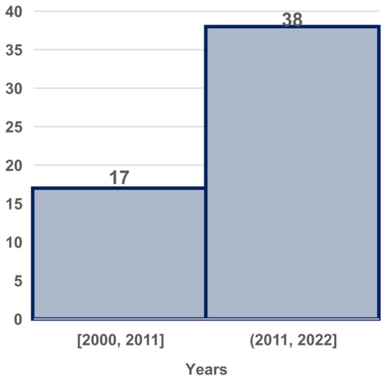 The included studies were published from 2000 to 2023; Figure 2 depicts a representation of studies in the past decade and earlier, including 17 that were conducted before 2011 and 38 conducted after 2011. These studies were organized into six categories (Figure 3). A total of 33% of the studies focused on cognitive functions (cognition, attention, and memory); 20% focused on sleep, anesthesia, and fatigue; 17% focused on emotion, 16% focused on MI; 11% focused on motor movement; and 3% focused on resting state. Overall, cognitive function (32%) was more frequently addressed than other brain functions. Thus, these categories correspond to the mental processes that we sought to investigate in RQ1. Each category is explored in more depth in the discussion section.