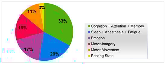 The selected articles were classified into the following six categories: (1) cognitive functions; (2) sleep, anesthesia, and fatigue; (3) emotion; (4) motor imagery (MI); (5) motor movement; and (6) resting state.