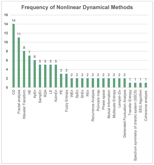 In all studies included in this analysis, the CD was the most frequently used nonlinear method to assess chaos (Figure 4). It was found that CD and fractal analysis techniques made the most significant contributions to chaos analysis. The major chaotic measures used to characterize different brain functions (RQ2) are shown in Figure 4. These methods are chaotic measures used to analyze EEG signals.