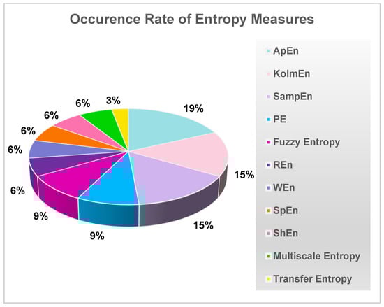 In studies that employed entropy metrics to examine chaos, ApEn, KolmEn, and SampEn algorithms accounted for the largest proportion of entropy methods used in these studies (Figure 5).