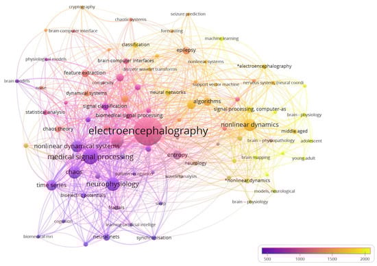For the co-occurrence of keyword analysis, we set a minimum threshold of five occurrences for a keyword. Out of 1180 keywords, only 95 met this threshold and were used to create a network visualization graph using VOSviewer software (Version 1.6.19) (Figure 6). General keywords, such as human, male, female, adult, and diseases, were excluded from the analysis. The graph shows that the keywords related to electroencephalography, nonlinear dynamics, and algorithms had the highest occurrence frequency and were closely related to other relevant keywords. The strength of the links between keywords was represented by a numerical value calculated by counting the number of publications in which two keywords appear together.