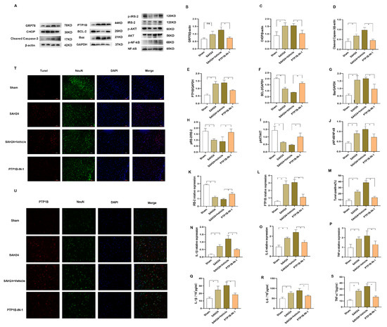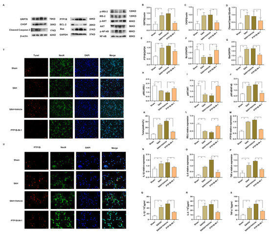 PTP1B-IN-1 alleviated neuroapoptosis and neuroinflammation following SAH in vivo via the IRS-2/AKT pathway. (A–J) Representative Western blot band and densitometric quantification of the time-dependent expression of p-IRS-2, IRS-2, p-AKT, AKT, p-NF-κB, NF-κB, PTP1B, Bax, Bcl-2, Cleaved Caspase-3, GRP78, and CHOP at 24 h SAH. The expression of PTP1B was upregulated after SAH. * p < 0.05, ns p > 0.05. Data are presented as mean ± SD, n = 3 per group. Samples derived from the same experiment and the gels were processed in parallel. Quantitative analysis should be normalized to β-actin/GAPDH. Individual gels were run for the separate proteins (p-IRS-2, IRS-2, p-AKT, AKT, p-NF-κB, and NF-κB) when the amount of loading protein was consistent. (K,L) SAH affected the expression of PTP1B and IRS-2 through PCR. * p < 0.05. Data are presented as mean ± SD, n = 4 per group. (M) The knockdown of PTP1B by PTP1B-IN-1 reversed the trend of TUNEL compared with that of the SAH24 + Vehicle group. * p < 0.05. Data are presented as mean ± SD, n = 3 per group. (N–S) The arterial blood promoted inflammatory cytokines (IL-1β, IL-6, and TNF-α) at 24 h SAH in the bilateral temporal cortex through PCR and Elisa. * p < 0.05. Data are presented as mean ± SD, n = 4 per group. (T) Immunofluorescence revealed that treatment with PTP1B-IN-1 reduced the number of TUNEL-positive cells at 24 h SAH in the bilateral temporal cortex, n = 4 per group, scale bar = 50 μm. (U) Immunofluorescence revealed that treatment with PTP1B-IN-1 reduced the expression of PTP1B at 24 h SAH in the bilateral temporal cortex, n = 3 per group, scale bar = 20 μm.