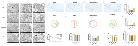 PTP1B-IN-1 ameliorated neurological impairments following 24 h SAH. (A) The PTP1B inhibitor could improve ER damage after SAH. The TEM (Transmission Electron Microscopy) showed dilated rough ER fragments in the bilateral temporal cortex. PTP1B-IN-1 could alleviate morphological changes, n = 4 per group. (B–F) The outline and the proportion of surviving neurons induced by SAH changed significantly, which could be improved by PTP1B-IN-1 at 24 h SAH in the bilateral temporal cortex. * p < 0.05. Data are presented as mean ± SD, n = 4 per group, scale bar = 20 μm. (G–L) The arterial blood exposure pointedly prolonged the probe time on the 5th day of the probe test, which could be alleviated by PTP1B-IN-1. PTP1B-IN-1 could obviously shorten the increase in escape latency induced by SAH. The mice in the SAH24 + Vehicle group had a lesser number of entries into the platform in the spatial probe test, which could be improved by PTP1B-IN-1. (M–P) The PTP1B-IN-1 group presented better neurological functions compared with those of the SAH24h+ Vehicle group. Brain water content, the modified Garcia scale, arterial blood glucose, and bodyweight change could be improved by PTP1B-IN-1. ns p > 0.05, * p < 0.05. Data are presented as mean ± SD, n = 3 per group.