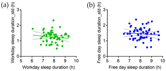 Correlation between sleep duration and intra-individual variation (_std) on (a) workdays and (b) free days.