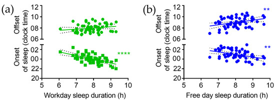 Correlation of sleep duration with sleep onset and sleep offset on (a) workdays and (b) free days. ** p < 0.01, **** p < 0.0001; slope of linear regression is significantly different from zero.