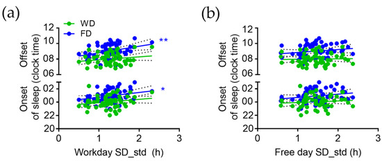Correlation of intra-individual variation in sleep duration (SD_std) on (a) workdays and (b) free days with sleep onset and sleep offset. * p < 0.05, ** p < 0.01; slope of linear regression is significantly different from zero.