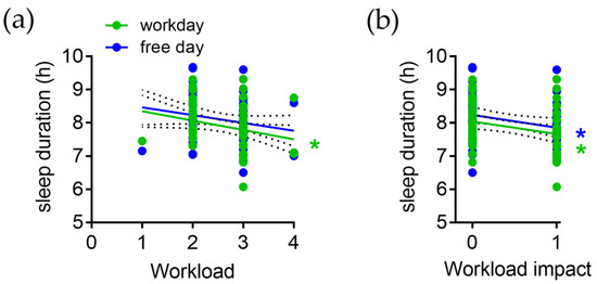 Correlation of sleep duration on workdays (green) and free days (blue) with (a) subjective workload and (b) subjective impact of high workload on sleep. * p < 0.05, slope of linear regression is significantly different from zero.