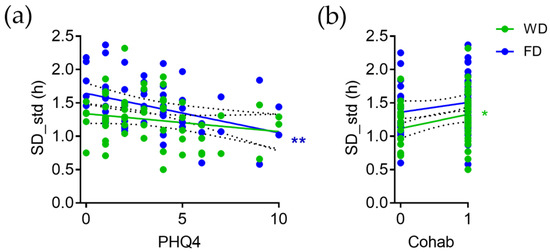 Correlation of intra-individual variation in sleep duration (SD_std) on workdays ((WDs) green) and free days ((FDs) blue) with (a) symptoms of depression and anxiety (PHQ4) and (b) living in the community (cohab). * p < 0.05, ** p < 0.01; slope of linear regression is significantly different from zero.