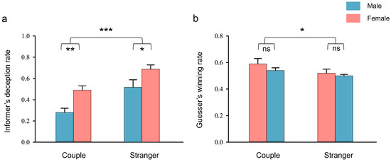 Previous studies have revealed gender differences in deceptive behavior, indicating that males cheat more than females, especially with black lies, which benefit the deceiver but cost another person [6,7]. From an evolutionary perspective, this difference can be explained by sexual selection theory, in which males historically faced more substantial incentives and fewer costs for deceptive behavior [8]. As for mixed-gender interactions, evolution theory hypothesized that both sexes have evolved strategies to convey desirable traits to potential partners of the opposite sex [9]. Therefore, since honesty is a desirable trait that both sexes seek in their partner [10,11], less deception will occur in a mixed-gender context. This hypothesis was already supported by a previous study that gender composition systematically affects behavior [12]. However, whether there is a difference in deceptive behavior between the two mixed-gender composition types (male to female vs. female to male) is open to be explored.