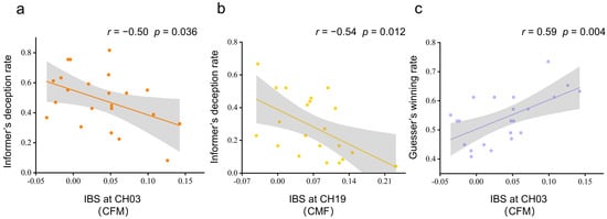Correlations between behavioral results and IBS. (a) Pearson’s correlation between IBS at CH03 and the informer’s deception for the CFM group. (b) Pearson’s correlation between IBS at CH19 and the informer’s deception for the CMF group. (c) Pearson’s correlation between IBS at CH03 and the guesser’s winning rate for the CFM group. The gray area indicates the 95% confidence interval.