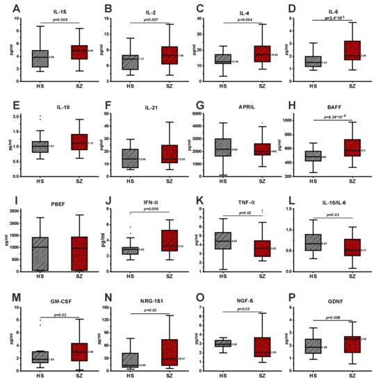 Serum levels of IL-1β (A), IL-2 (B), IL-4 (C), IL-6 (D), IL-10 (E), IL-21 (F), APRIL (G), BAFF (H), PBEF/Visfatin (I), IFN-α (J), TNF-α (K), GM-CSF (M), NRG1-β1 (N), NGF-β (O), GDNF (P), and IL-10/IL-6 ratio (L) in patients with schizophrenia and healthy individuals. Outliers identified by Tukey’s test are shown as black dots. The figure shows only statistically significant differences (p-values) calculated using the Mann–Whitney U test with Benjamini–Hochberg correction for multiple comparisons.