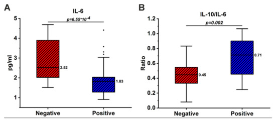Further, all patients were divided into subgroups with prevailing negative or positive symptoms. Among all biomarkers, only the level of IL-6 was significantly higher in patients with prevailing negative symptoms (Figure 2A). The significantly low IL-10/IL-6 ratio in patients with negative symptoms also confirmed the pro-inflammatory state in this subgroup of schizophrenic patients (Figure 2B).